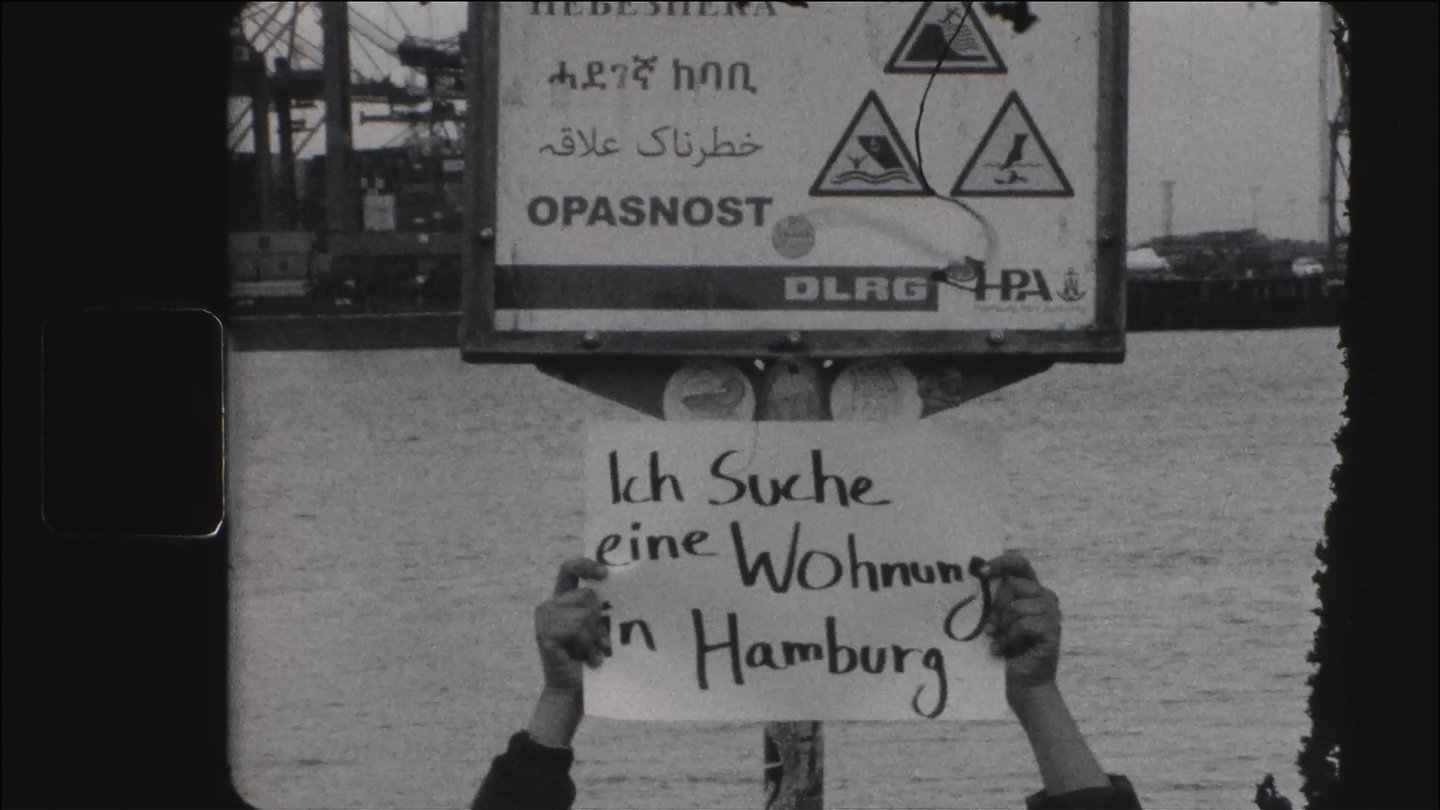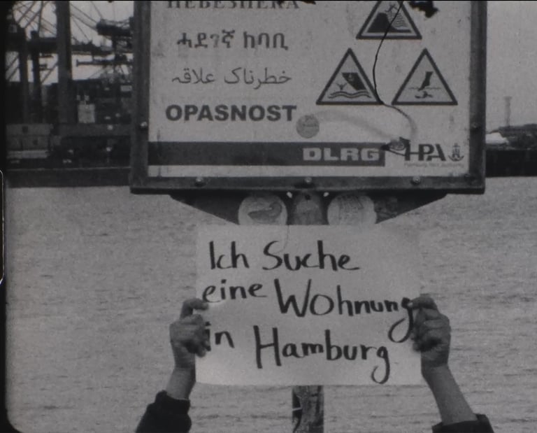 Shot on Super 8, the film follows my search for housing through Hamburg. A figure representing me appears with a sign in front of statues, public buildings, the Ausländerbehörde, and in areas where I have lived temporarily. The act of searching becomes visible in public space.The film also moves along the Elbe, which reminds me of Karachi, the coastal city I come from.